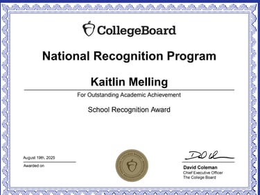 Earned a School Recognition Award from the College Board for "Outstanding Academic Achievement".