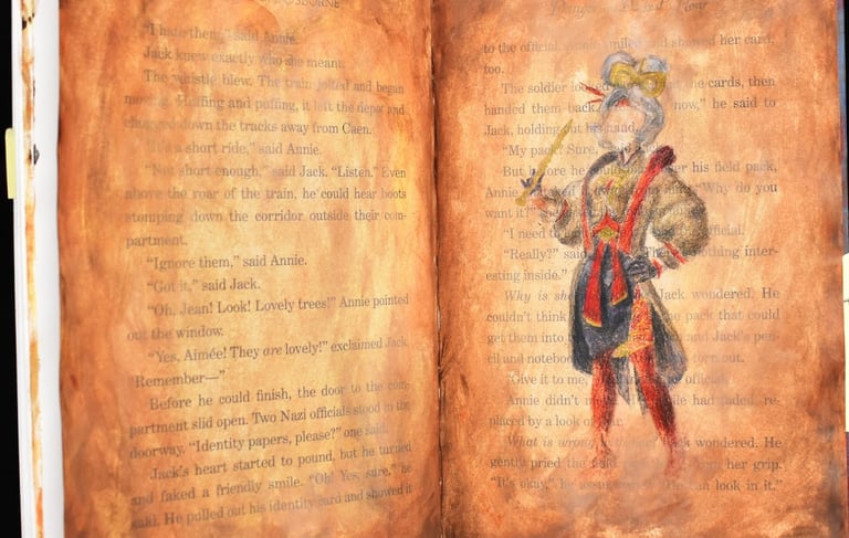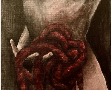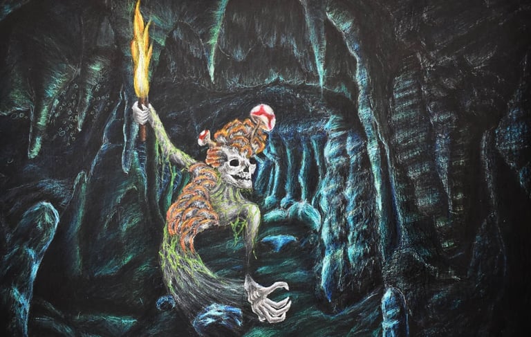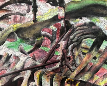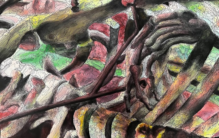 The artist utilized soft saturated colors contrasted with stressed ink marks to highlight the multifaceted nature of the skeleton.