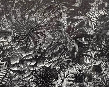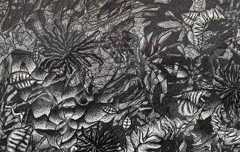 Created in pen and ink on paper, the artist uses zentangle patterns to fill the composition meticulously. The intricate, swirling designs are layered to evoke a dense, overgrown jungle, creating a sense of natural complexity and depth.