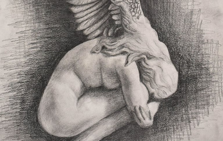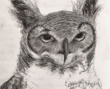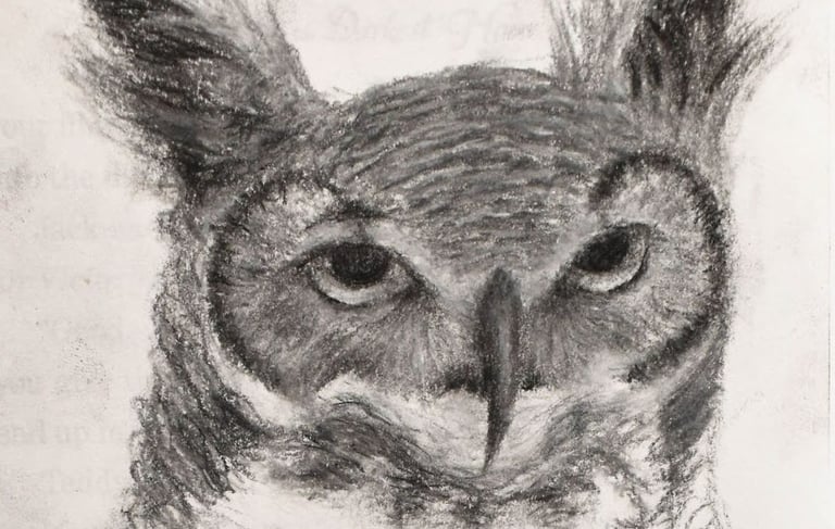 The artist focused on capturing fine detail in the face of the stern owl to create a sense of intensity, while intentionally leaving the center of the body blank to symbolically represent the subject's hollow feelings.