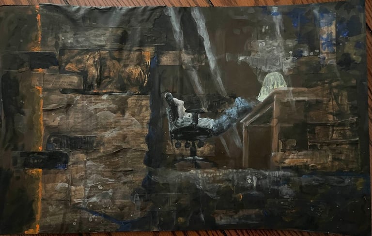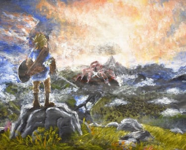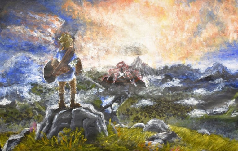 I used highly saturated warm and cool tones to amplify the dynamic contrast between the golden light of the sky and the deep blue-violet hues of the distant mountains. By employing thick, expressive acrylic brushstrokes, I sought to render Link's contemplative stance against a backdrop of the peaceful, yet expansive, natural world.